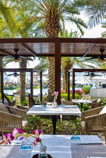Bodrum Restaurant showcases the flavours of the Turkish coast blended with Mediterranean influences. Guests can dine with panoramic views of the Dubai skyline and the Arabian Gulf. It is a serene setting for enjoying fresh seafood and coastal cuisine at sunset.