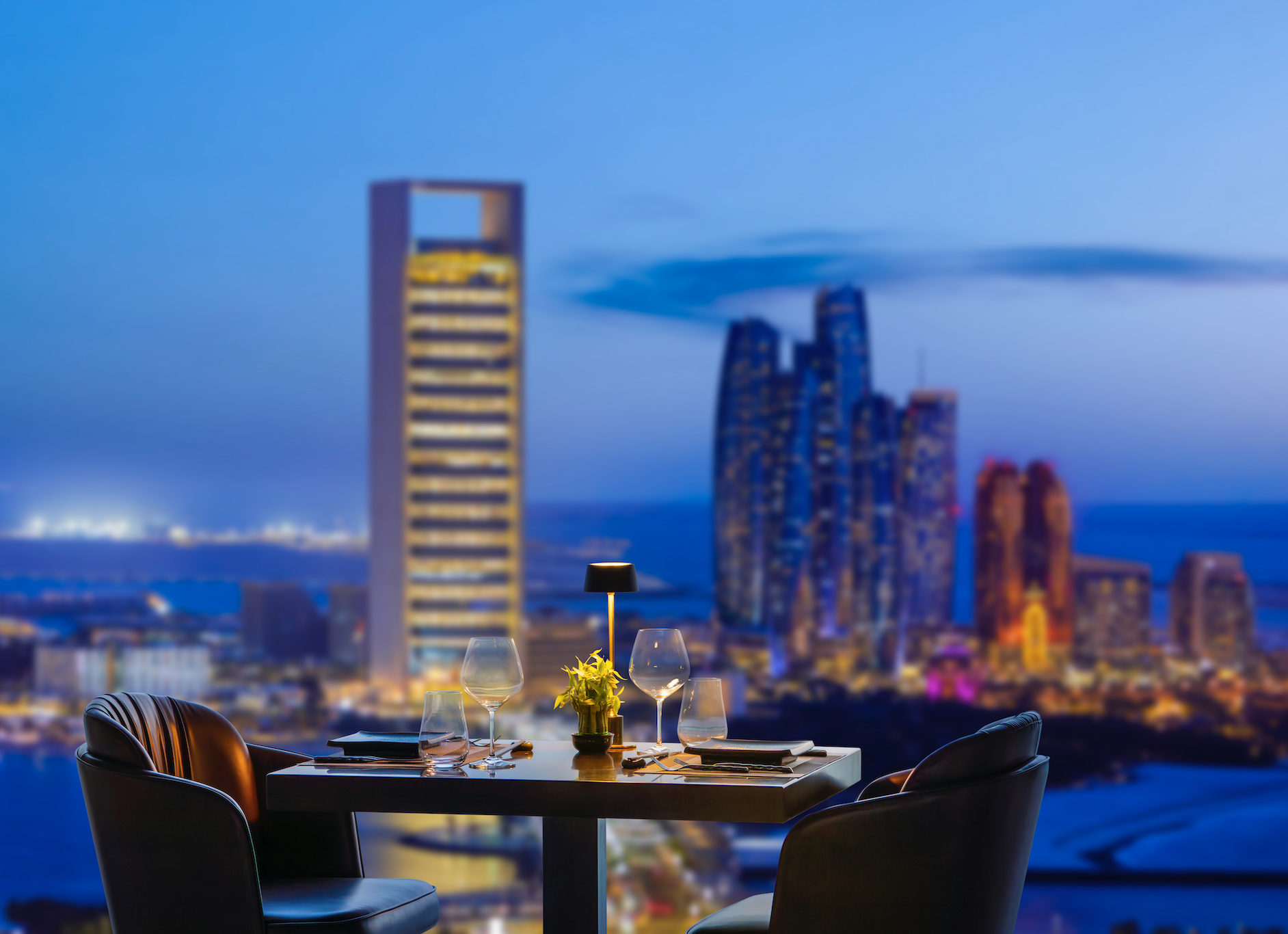 Geniet van de verfijnde Aziatische keuken in het Hashi Restaurant op de 38e verdieping, met panoramisch uitzicht op de skyline van Abu Dhabi en de Arabische Golf, een werkelijk uitzonderlijke culinaire ervaring boven de stad.
