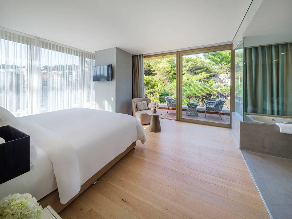 Recently renovated Presidential suite is an oasis of privacy and luxury. Elevate your experience to the highest level of exclusivity and style with our beautifully appointed suite and your own private balcony with views of the Adriatic Sea.